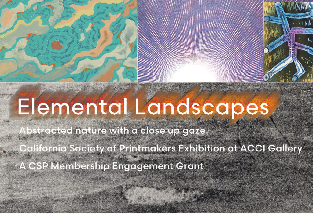 Elemental Landscapes is an invitational exhibition of 13 printmakers. The project was developed through a Membership Engagement Grant from the California Society of Printmakers. This grant was a way of connecting and working with the CSP membership during the pandemic of 2020–22.