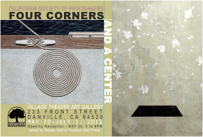 Four Corners and a Center exhibit highlights the diversity and creativity of contemporary printmaking and showcases techniques such as woodcut, monotype, etching and handmade artist books. The theme was selected by Amy Miller, Visual Arts Program Director of Danville’s city-run Village Theatre Art Gallery. Miller states, “Four Corners conjures images of location, direction, edges, boundaries a destination and even the entire planet. The Center can be one’s home life, an essence of an object, the soul, a state of being or a compositional element used to invoke power or focus. Even in an empty room or in a singular structure, the center remains a powerful position within any work of art.”